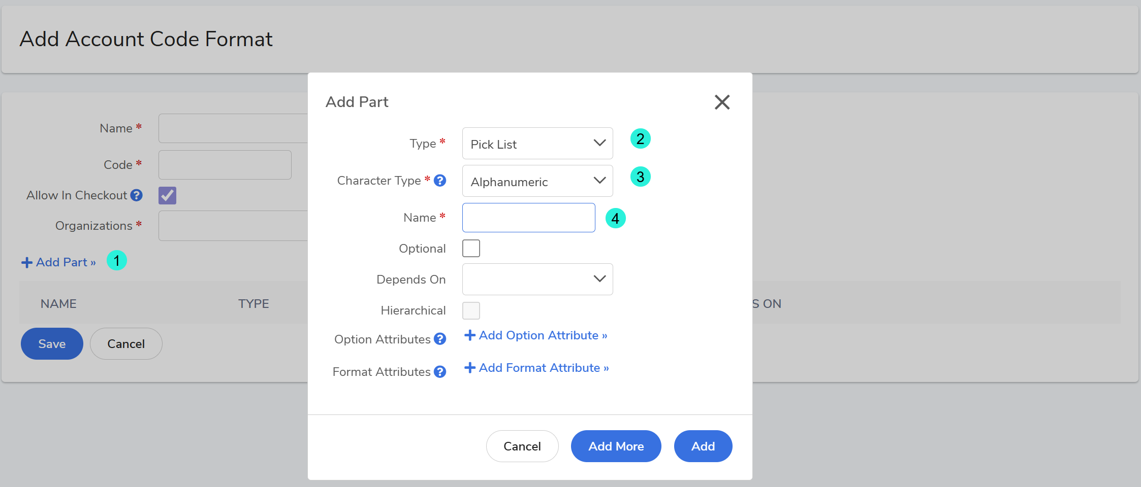 4. Once completed, select Add. To add additional account code parts, select Add More.