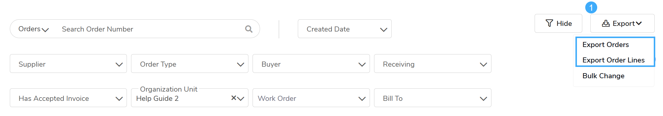 Exports: You can export Order Headers or Order Lines for specific units or entire parent/child trees.