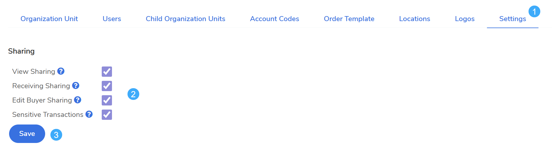 Check View Sharing, Receiving Sharing, or Edit Buyer Sharing as desired.