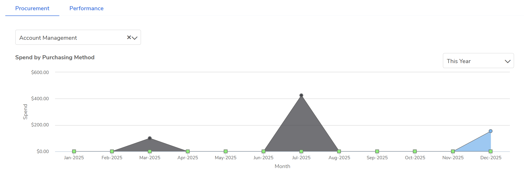 Insights: Use the Procurement Dashboard (Marketplace > Insights) to view spend graphs. Selecting a parent Org Unit will automatically include data from its children, often distinguished by different colors in the charts.
