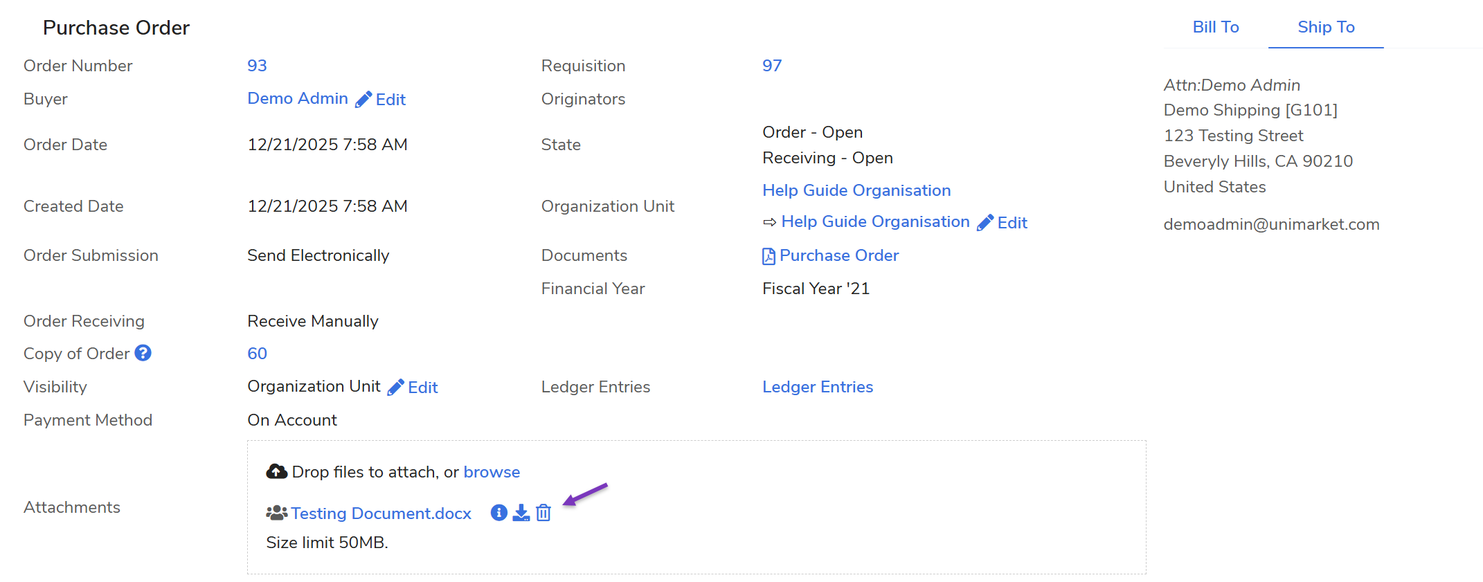 Size Limits: Each document (Requisition, Order, or Invoice) has a total attachment size limit of 50 MB.