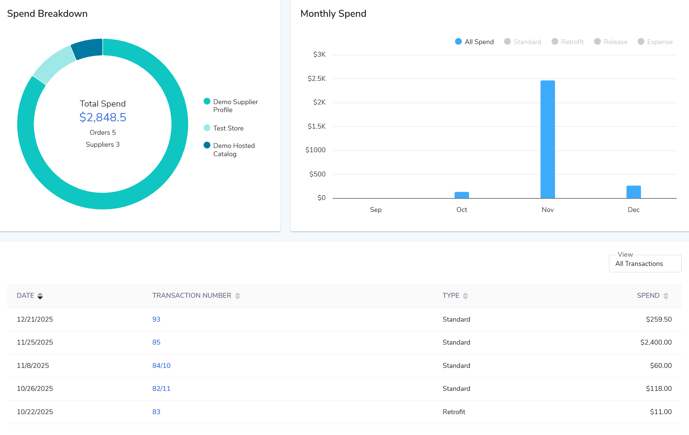 - By Method of Spend: Visualizes monthly trends comparing Catalog vs. Non-Catalog vs. Quote-based purchasing.