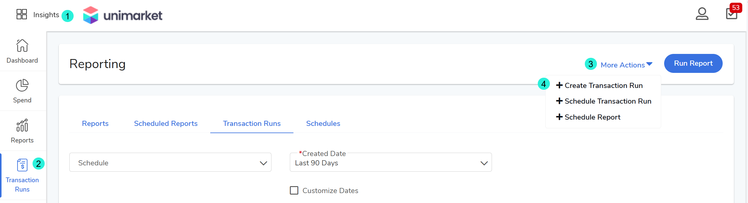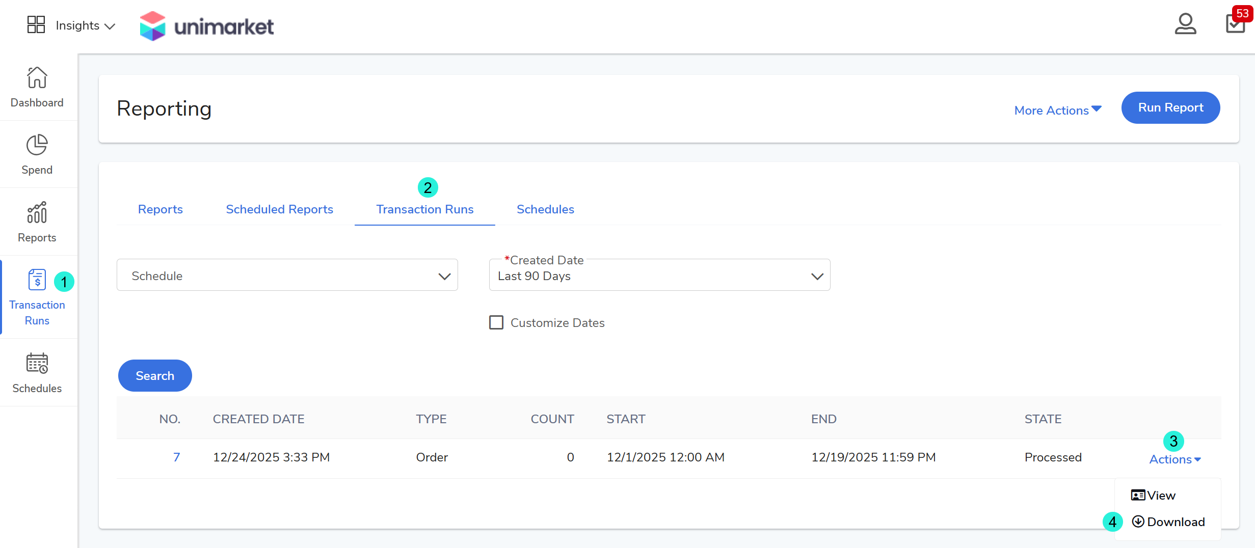 Navigate to the Insights module > Transaction Runs (on the left side panel).