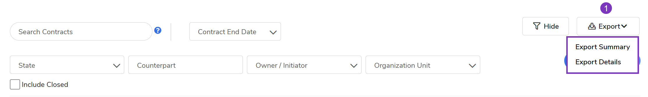 Note for Administrators: When running the Details Export, ensure you have selected a specific Contract Type in your search filters first, or the option may be greyed out.