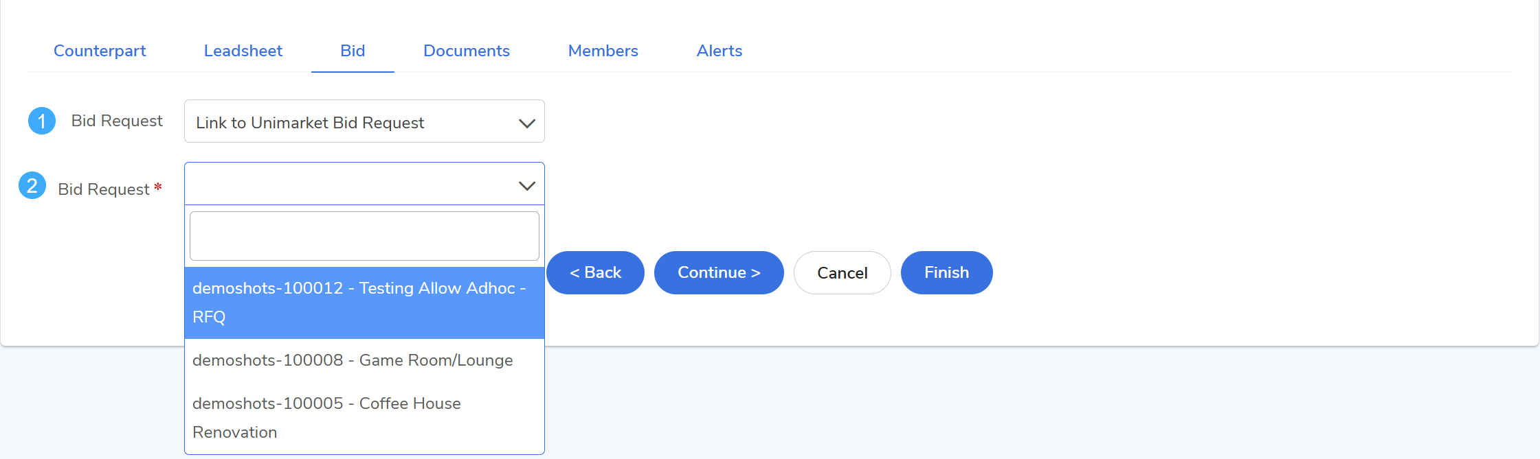 For Unimarket Bids: Select the desired bid from the Bid Request field. The system automatically links the details based on the supplier identified on the Leadsheet.