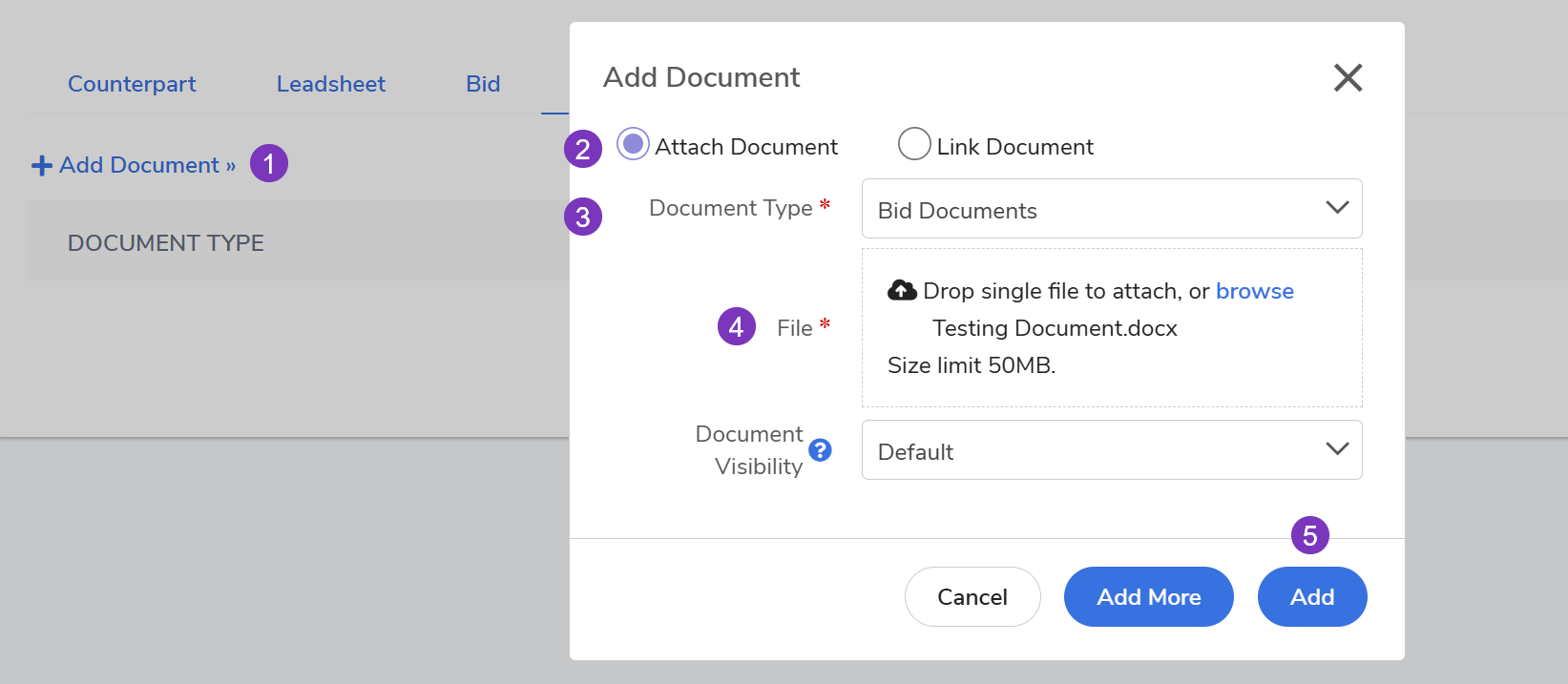 - Finalize: Click Add. If you have multiple files, click Add More to continue uploading before closing the pop-up.