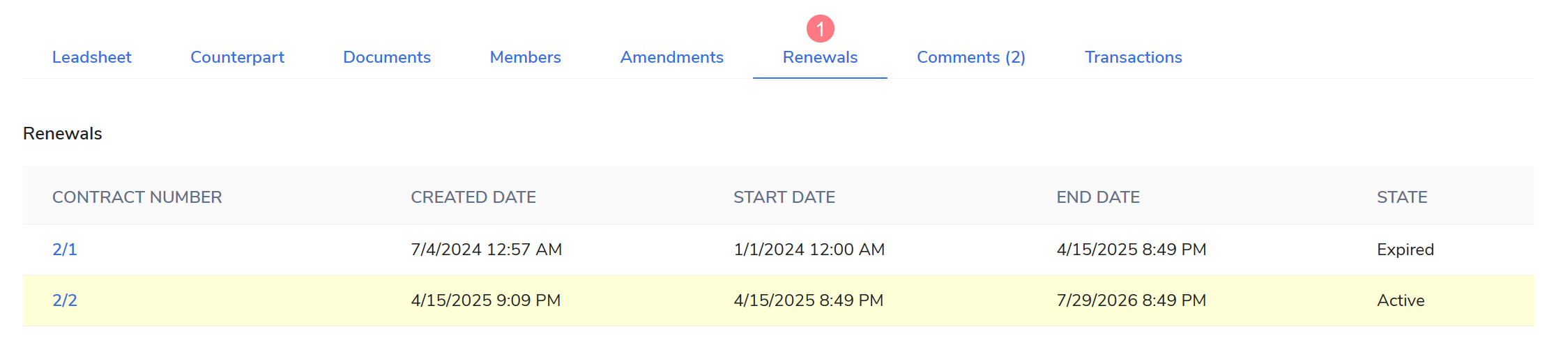 Once a contract has been renewed, a Renewals tab becomes visible on the contract record. This tab displays: