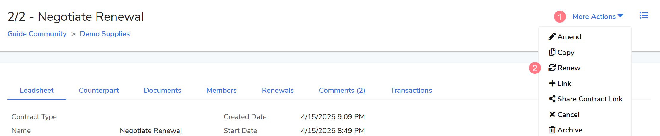 - Initiate: Click the More Actions menu (top right) and select Renew.