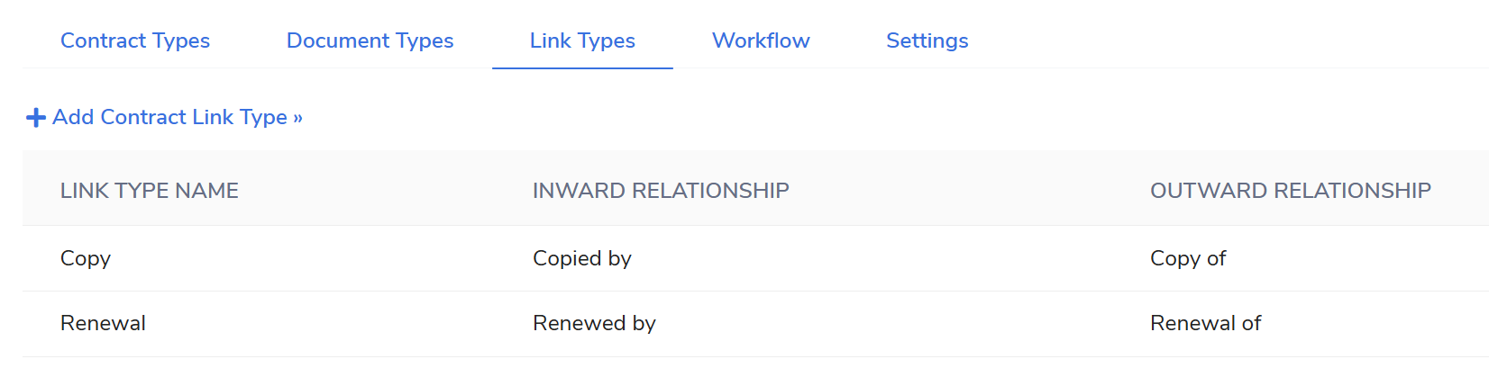Link Types define the relationships between different contracts in the system.