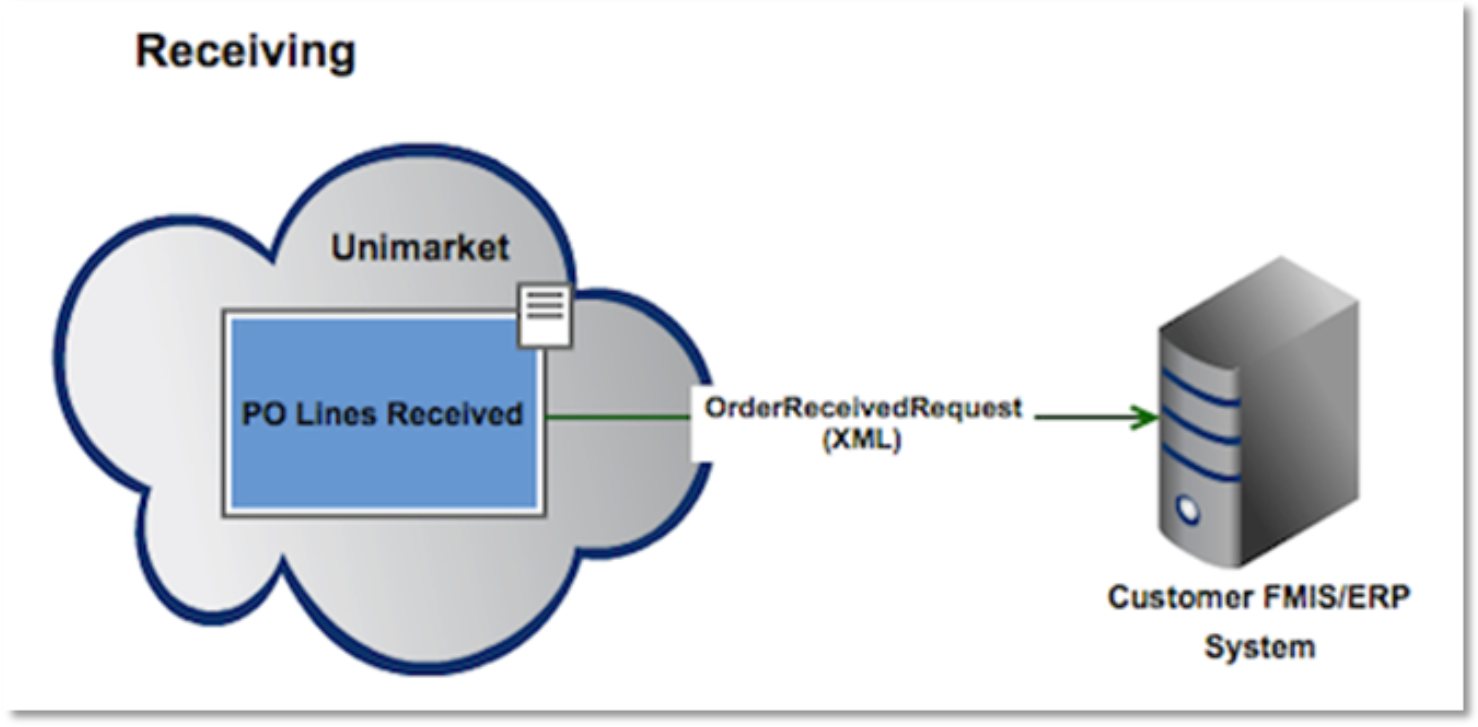 The order-received-request is an outbound integration point used to communicate receiving data from Unimarket to an external system, such as a customer's ERP or Finance solution. When a user records the receipt of goods or services against a Purchase Order line, in Unimarket. This message automatically triggers an update, to ensure the external system has an accurate record of the received quantity.