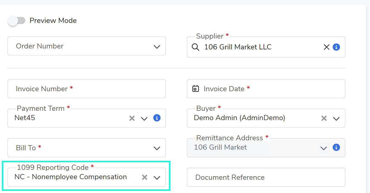 Once enabled, a 1099 Reportable section appears on the Create Invoice screen.