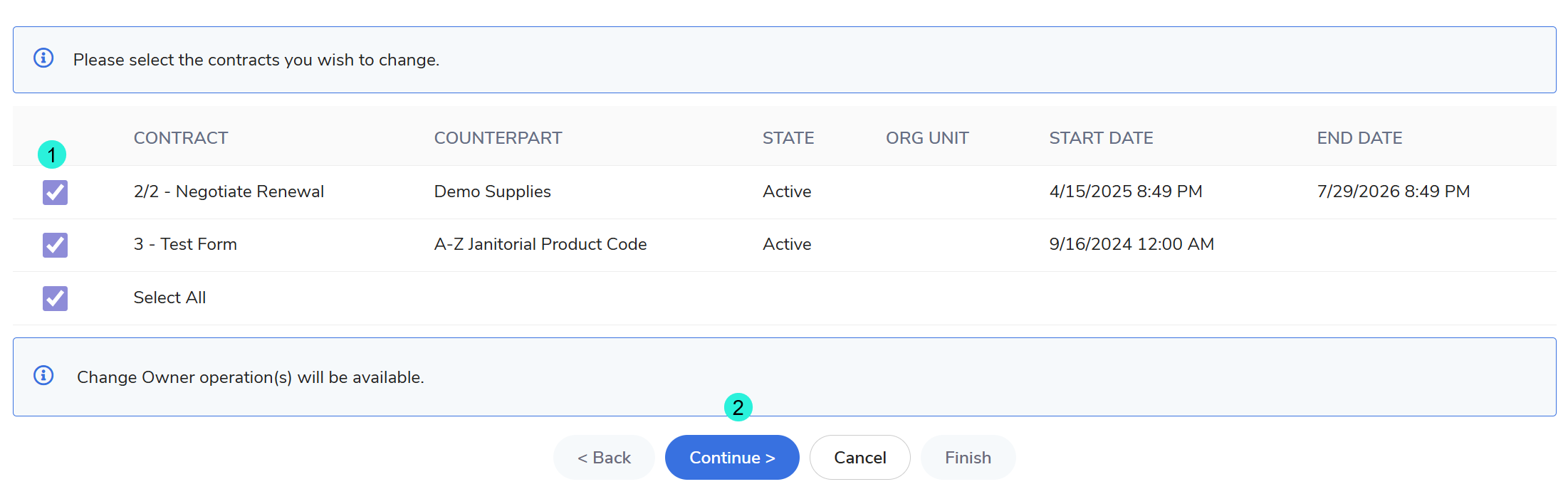 - A confirmation screen will populate. Review the list of contracts and the name of the new owner to ensure accuracy.
