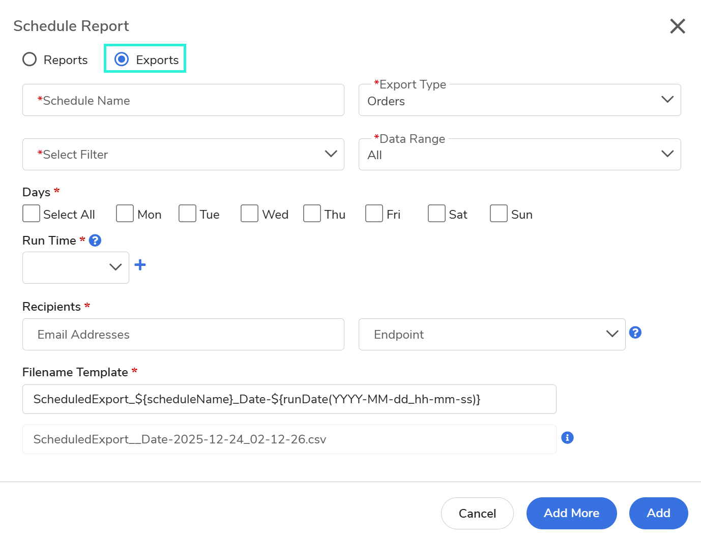 | Days / Run Time | Select the days and times for the export to trigger. |