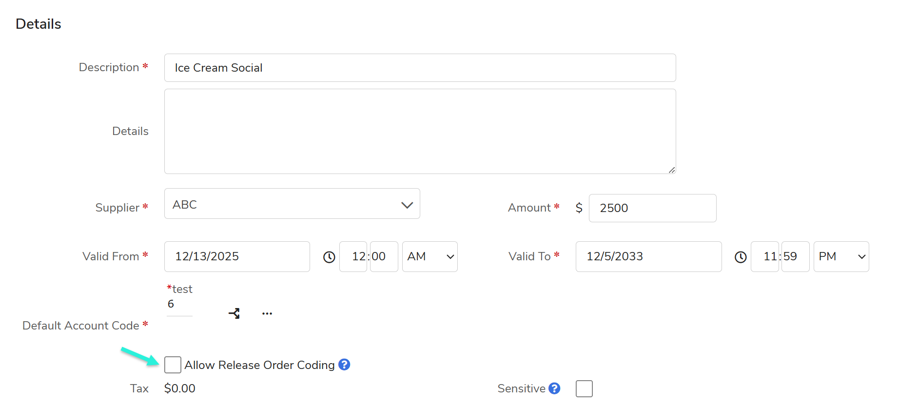 Allowed: If the Allow Release Order Coding box is checked, release orders can use account codes that differ from the code entered on the Blanket Order. The BO's Details tab will display Release Order Coding is ALLOWED.