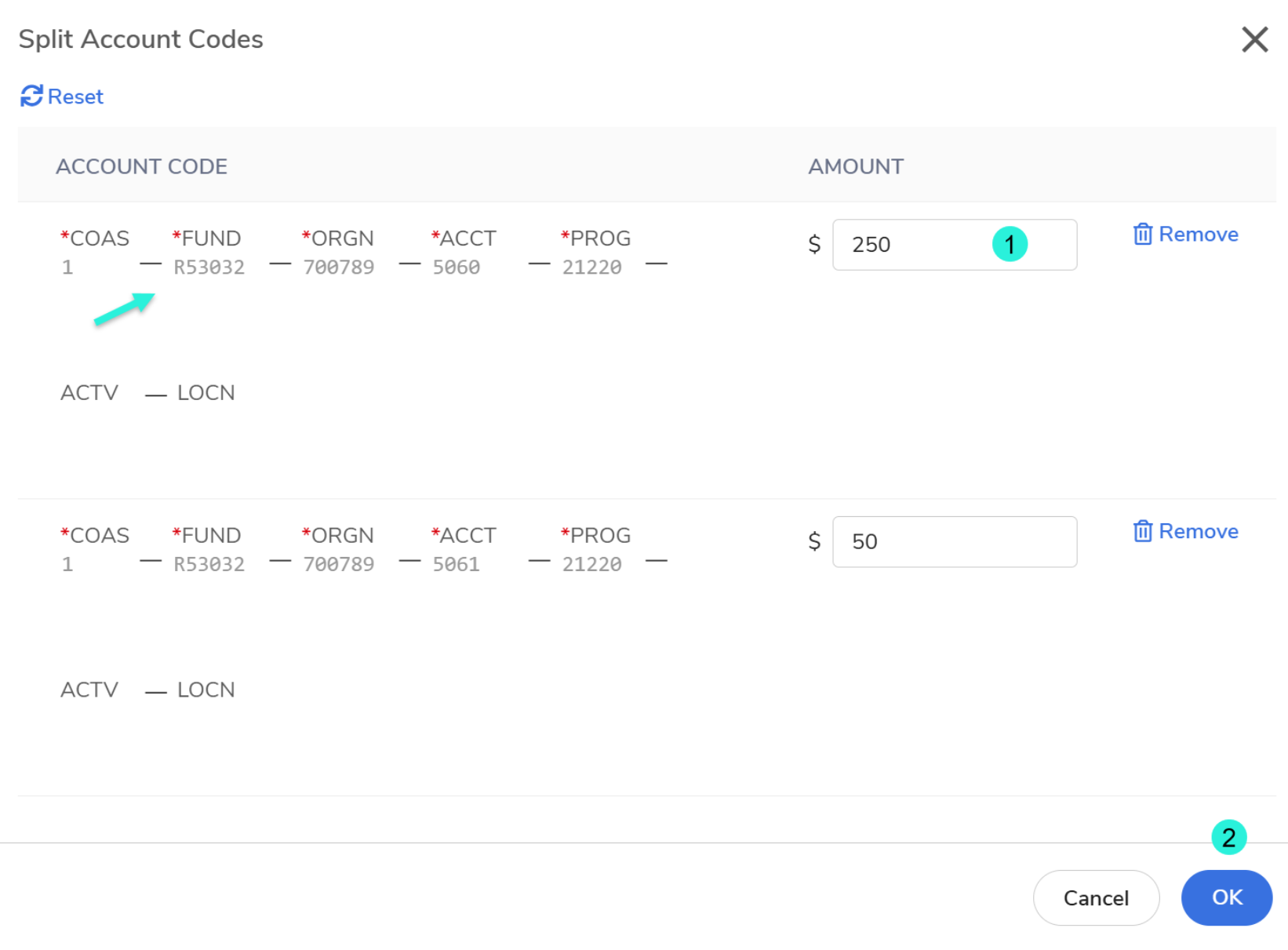 icon in the account code field > update the desired account code and amount. You can also select +Add Split to add more account code lines or Remove lines.
