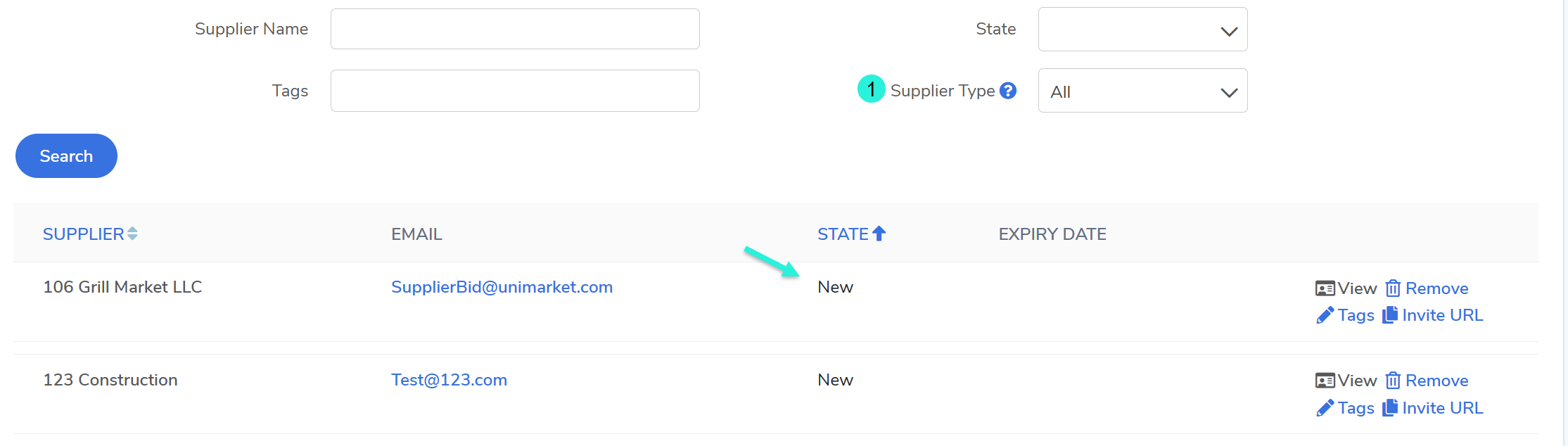 Status: Once added, the supplier(s) can be viewed by setting the Supplier Type field to All. Their State will appear as New. They will simultaneously receive an email notification.
