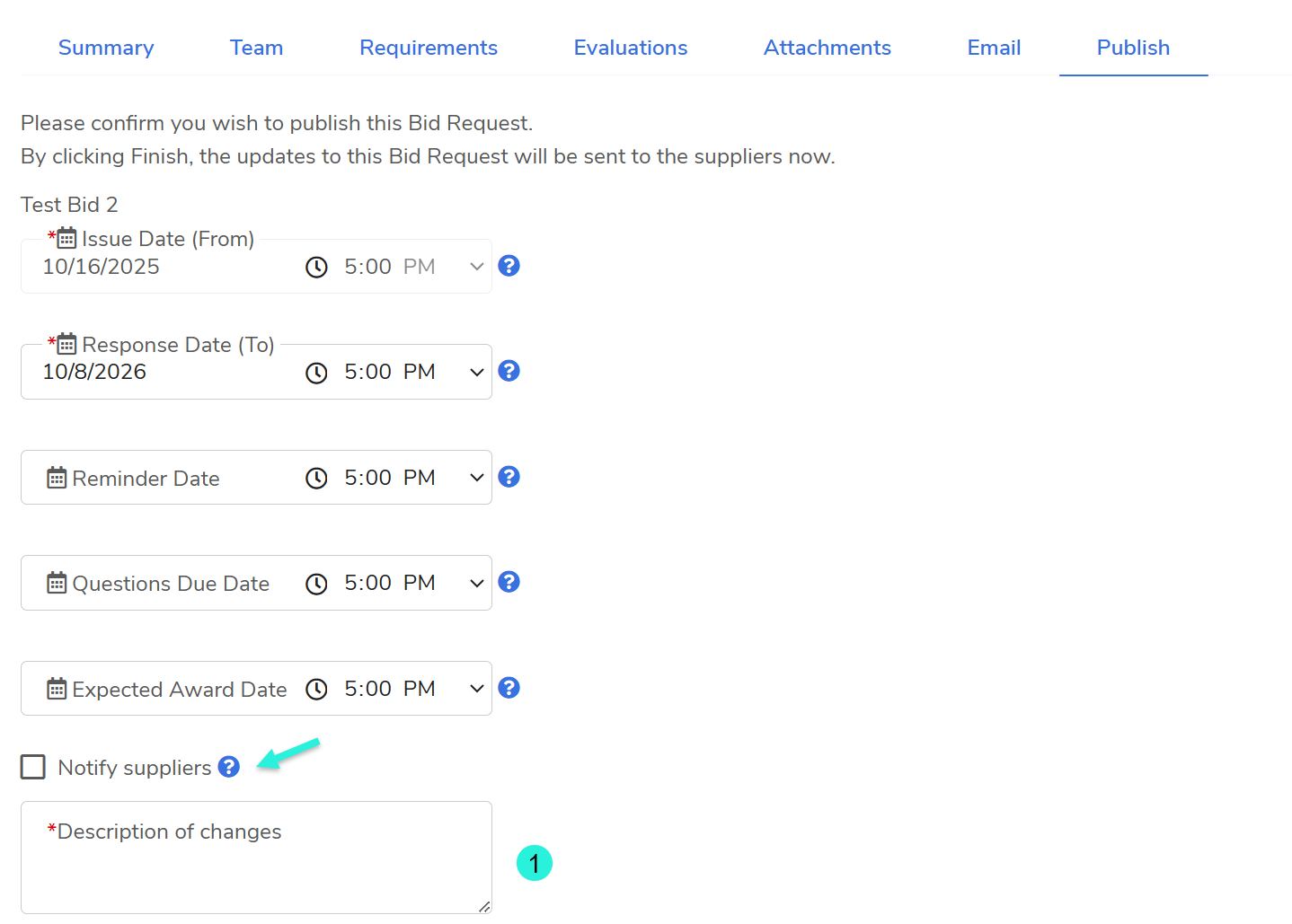 Publish Updates: To publish the bid with the updates, the user may need to update one or more fields on the Publish tab.