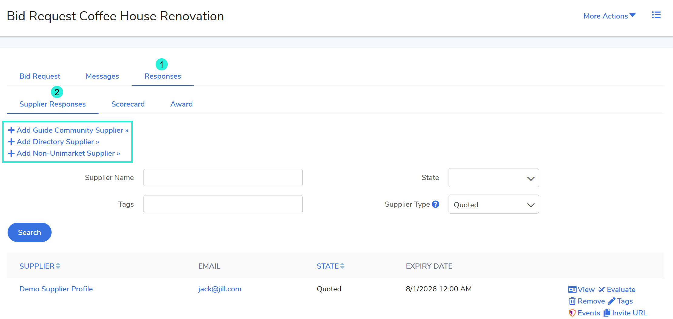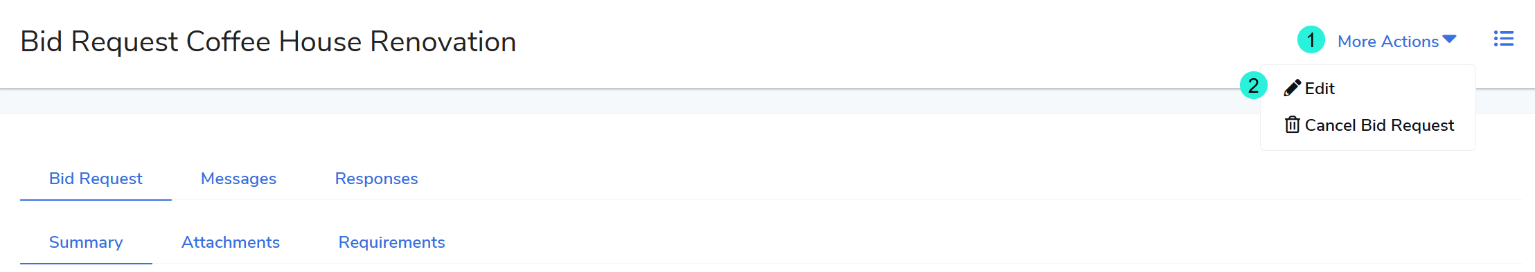 Extend Response Date: Locate the desired bid request > click More Actions > select +Extend Response Date.