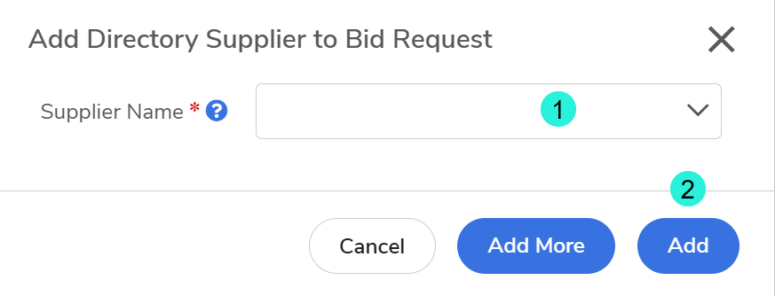 Selection: A pop-up box will appear. Use the dropdown in the Supplier Name field to select the desired supplier > select Add. Click Add More to add multiple suppliers.