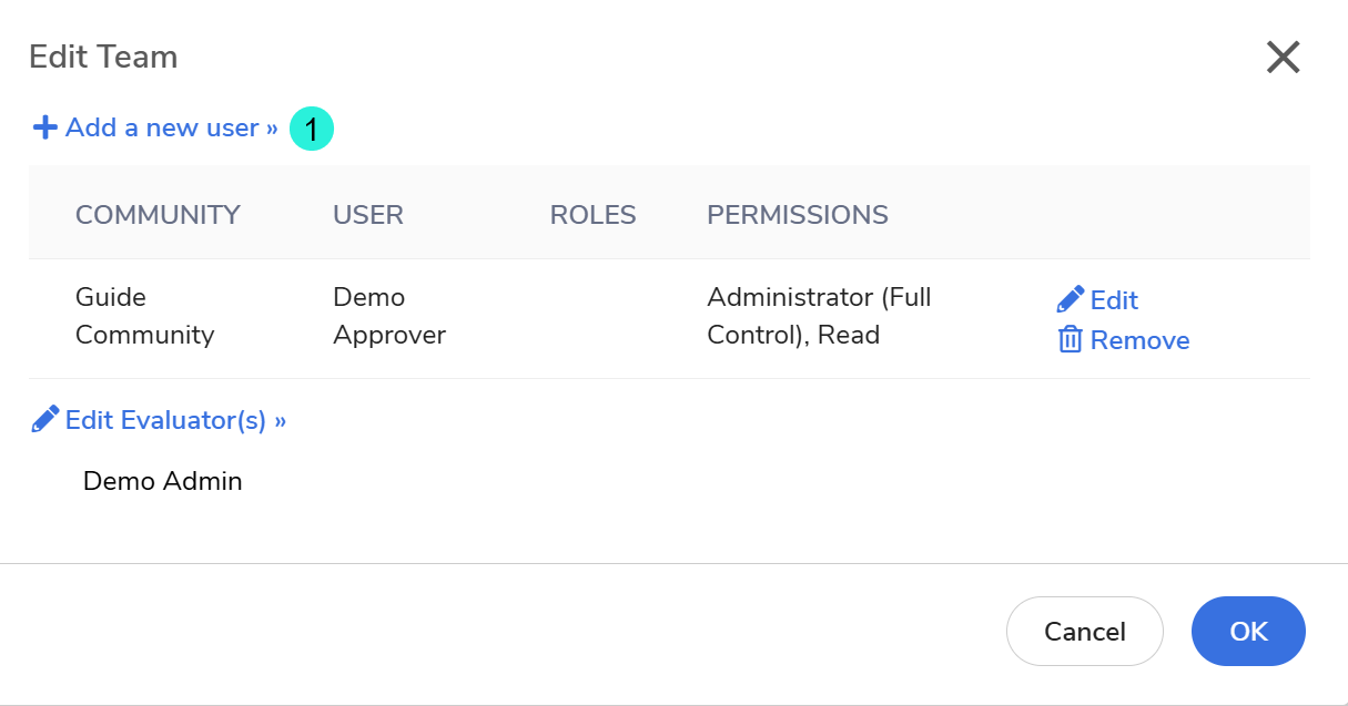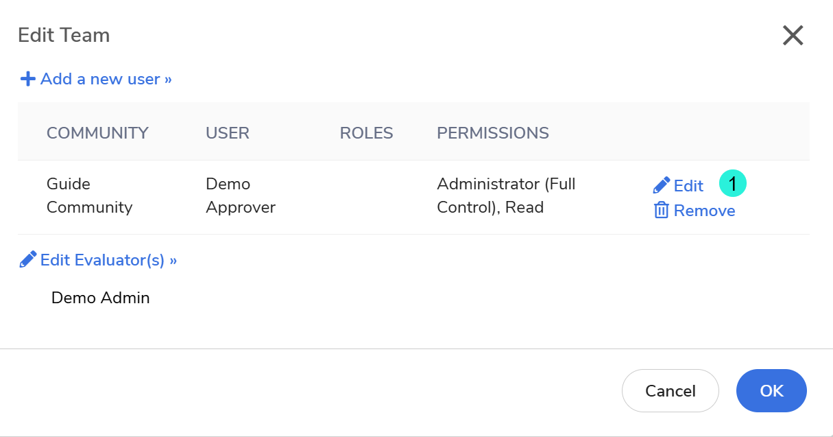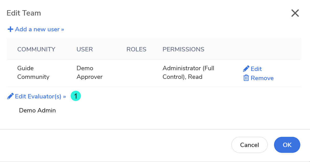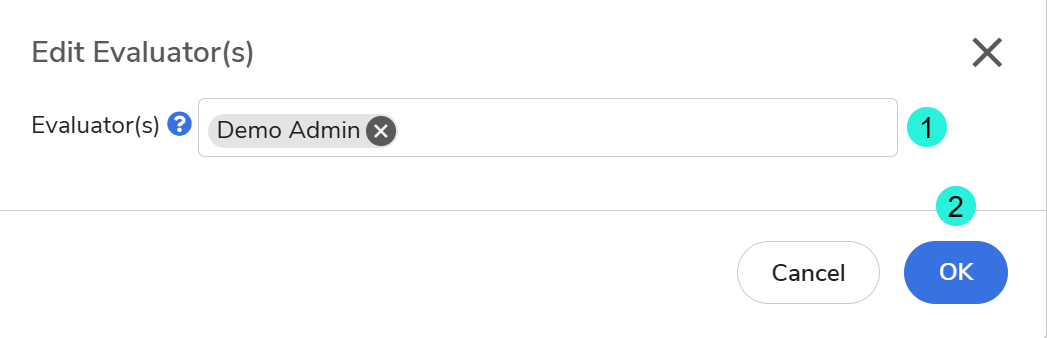 Edit Evaluator(s)pop-up box will appear. In the Evaluator(s) field, add or remove desired users > select OK.