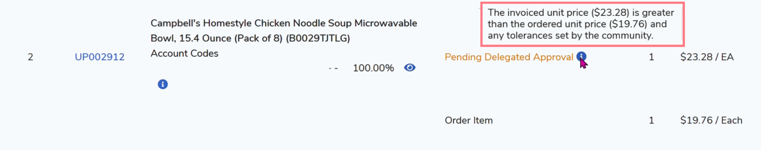 Line item 2 was invoiced at unit price of $23.28, which is greater than the ordered unit price of $19.76 and it is outside of the community's tolerance settings.