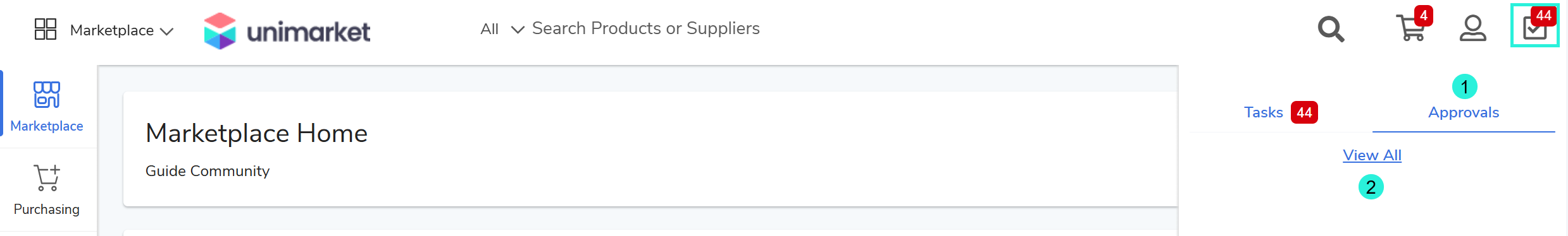 Access Tasks: Select the Tasks menu in the upper right corner > select the Approvals tab > click View All.