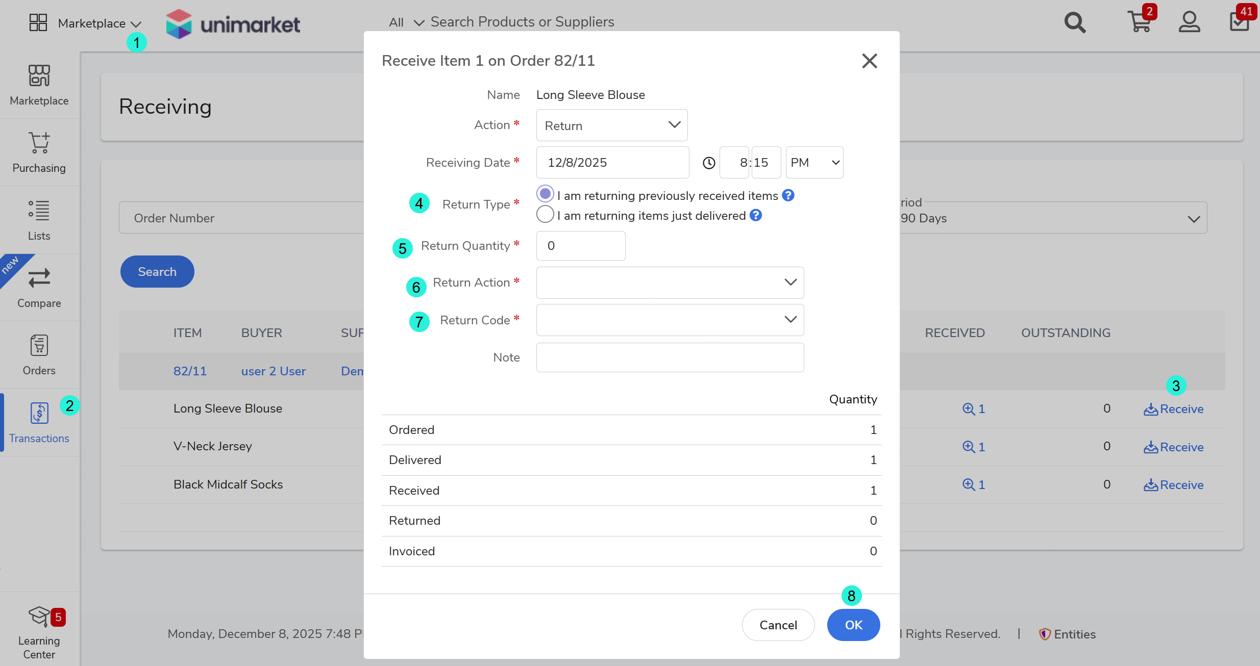 Crucial Note: Marking an item as returned is for receiving accuracy only within Unimarket. This information is not sent to the supplier. Always reach out to the supplier separately to process the physical return of goods.