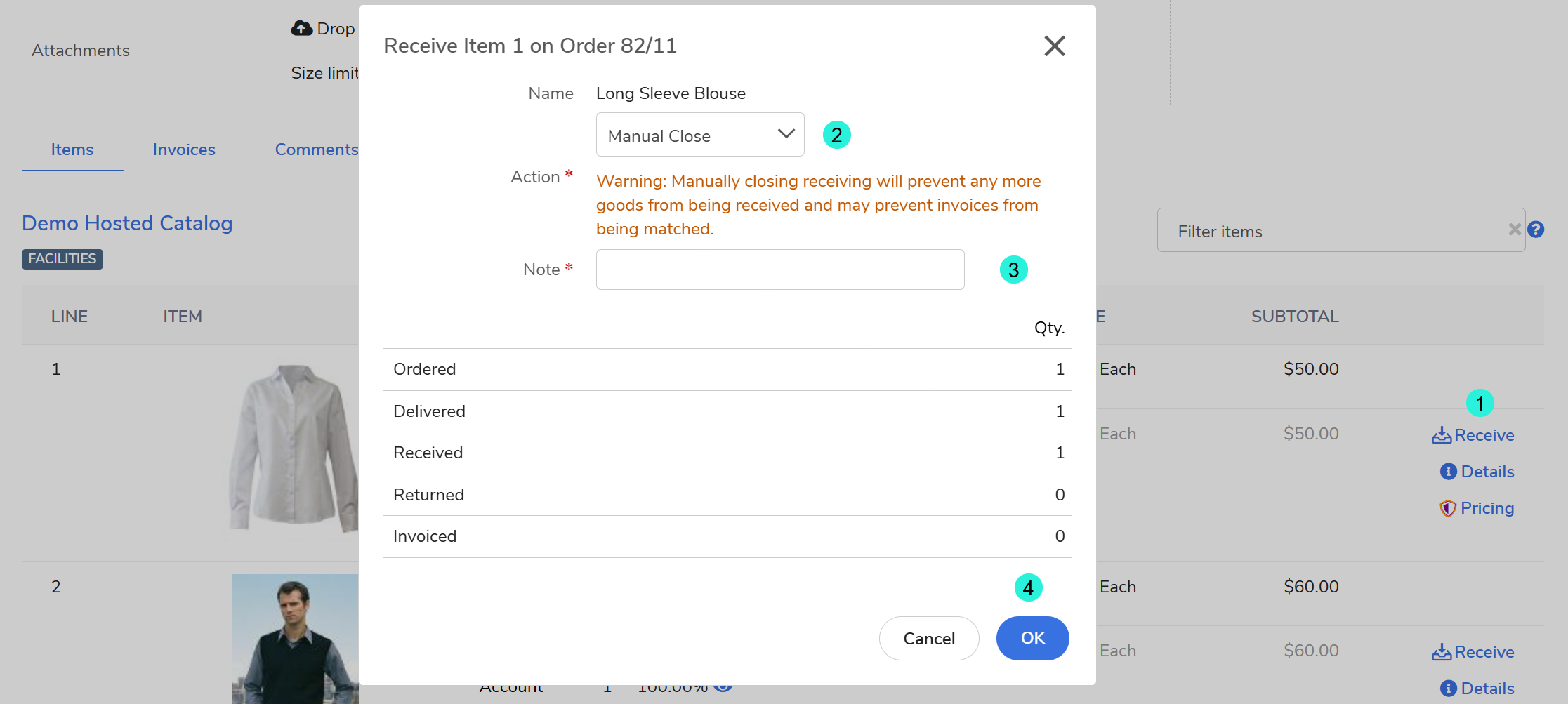 | 1. Initiate Close | Select Receive (again on the same line item). |