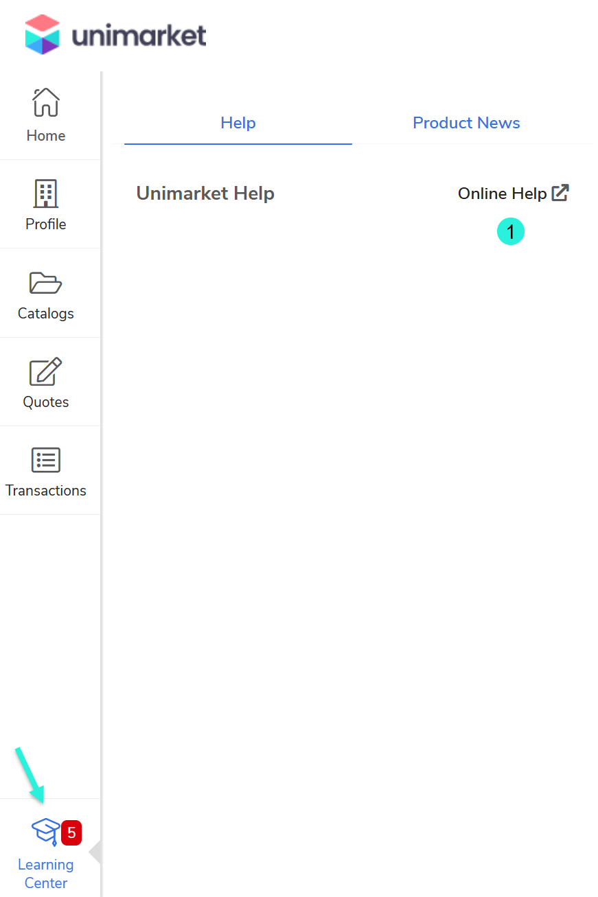 Click Online Help to access help articles, tutorials, and additional information about the Unimarket software.