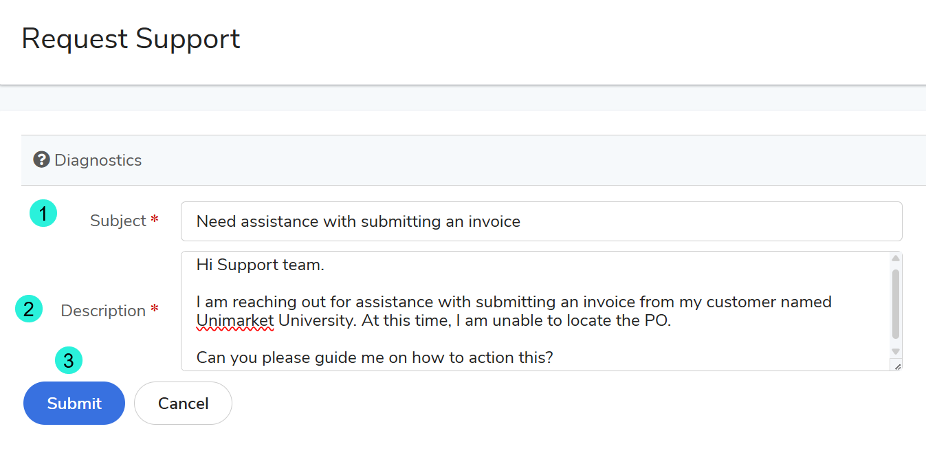 The Request Support screen will populate. Fill out the form, being as descriptive as possible and including the supplier's name and company information.