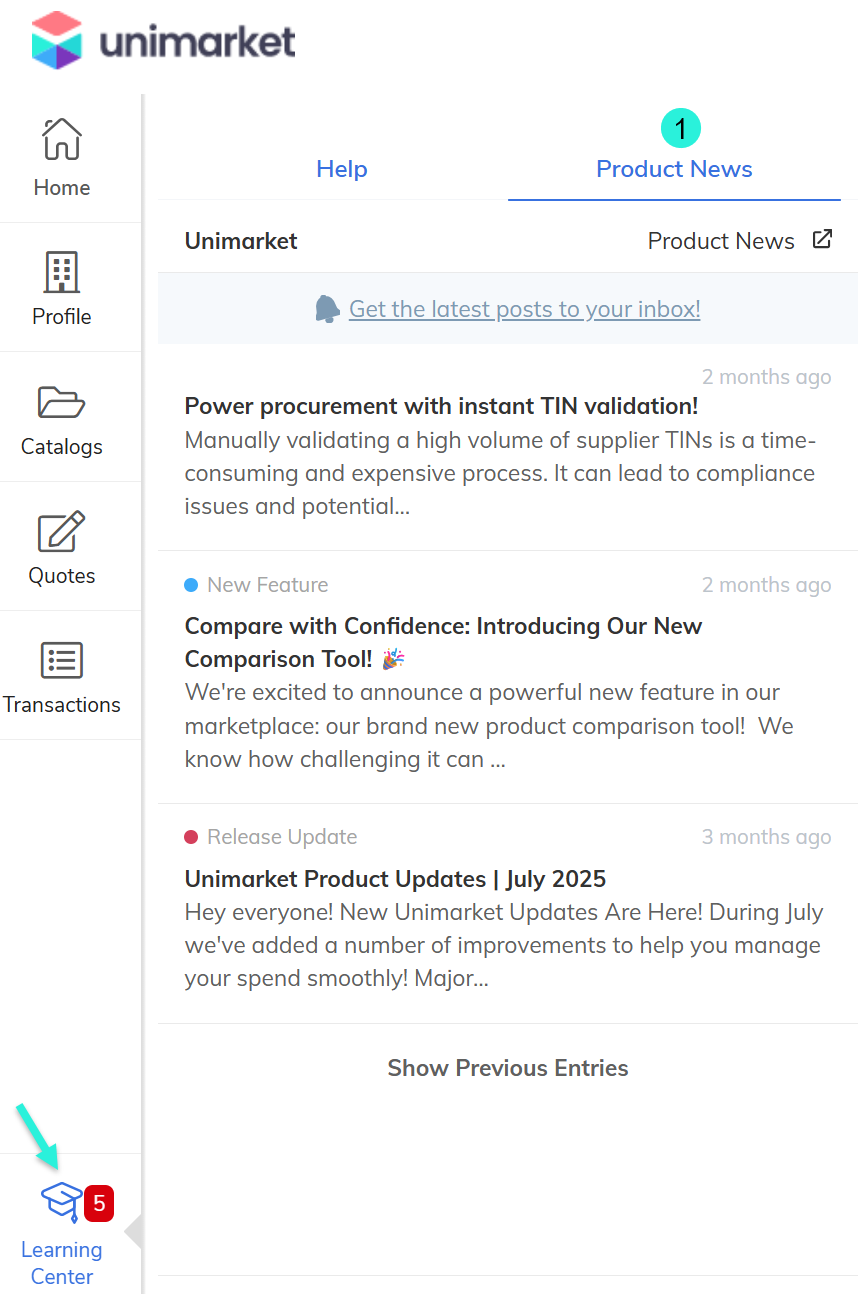 Unimarket provides multiple ways for suppliers to access help resources, product news, tutorials, and contact the Support team via an AI chat assistant.