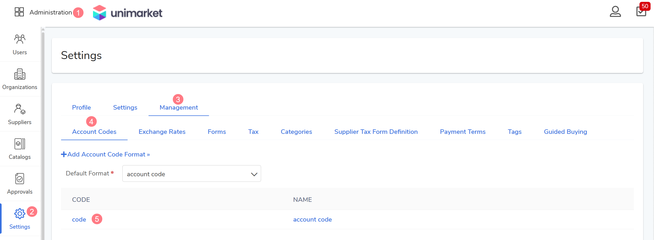 Locate: Go to the Administration module > select Settings > click Management tab > select Account Codes tab.