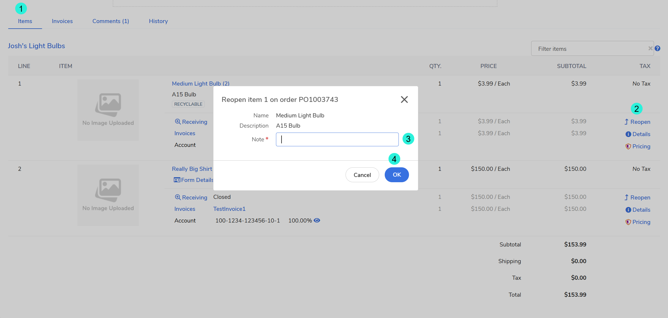 - Select Reopen: Locate the specific line item you want to adjust. In the actions or status area for that line, select the Reopen option.