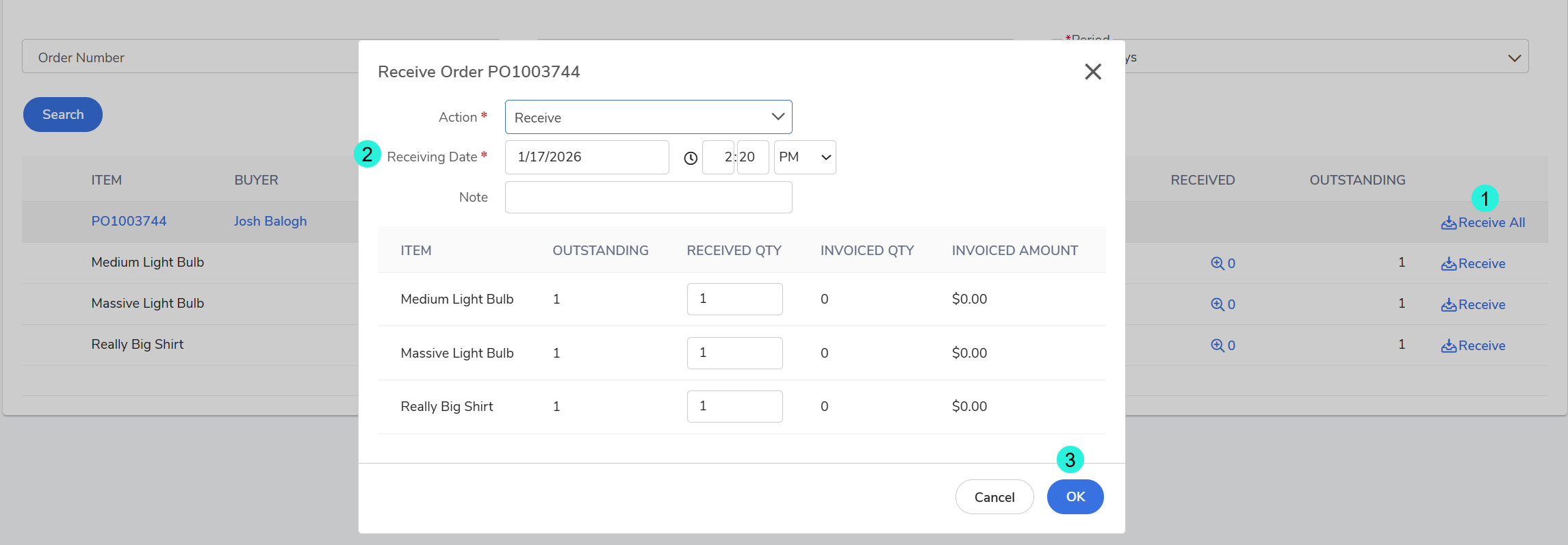 - Click the Receive All icon, next to the order to open the receiving interface.