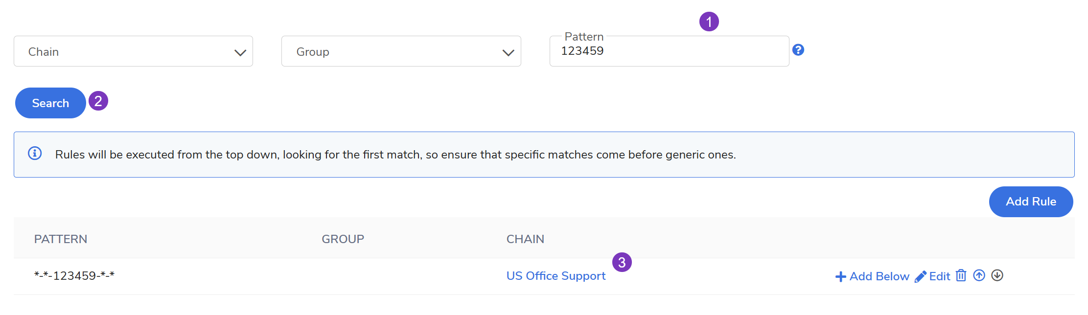 123459) to locate the mapping > click Search. - Review the results to identify the Chain Name associated with that pattern.
