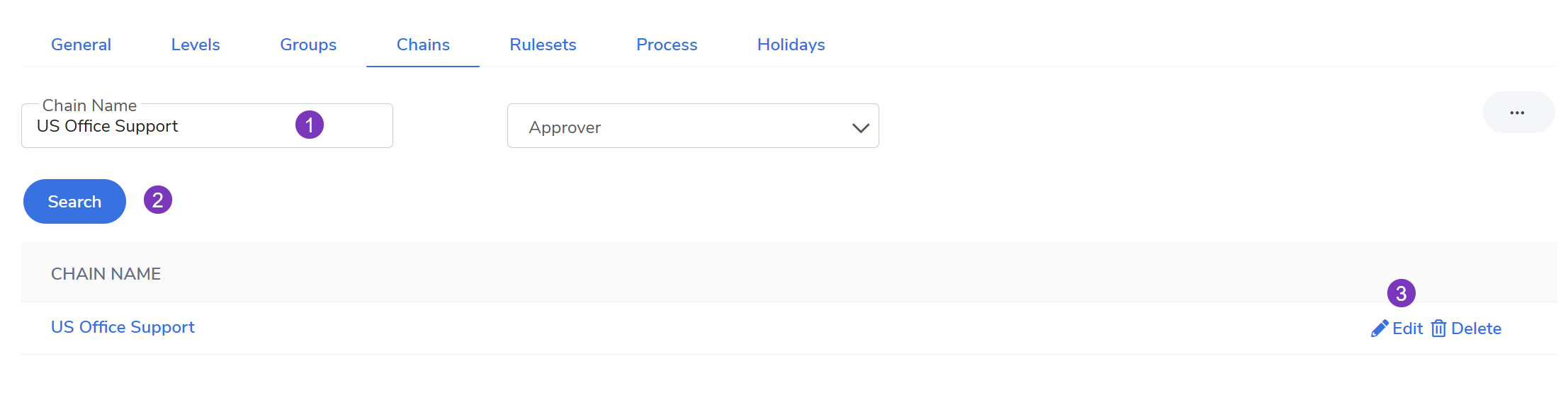 - Go to the Administration module > Approvals > Chains tab.
