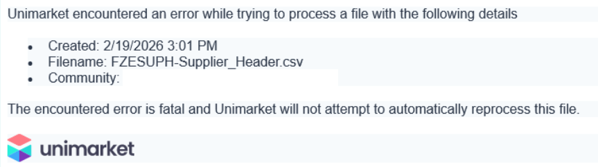 When your community is configured to update Supplier Header information via automated sFTP uploads. You may receive email notifications indicating that an error has occurred, during processing. This guide explains how to identify the specific failure and resolve the data conflicts within Unimarket.