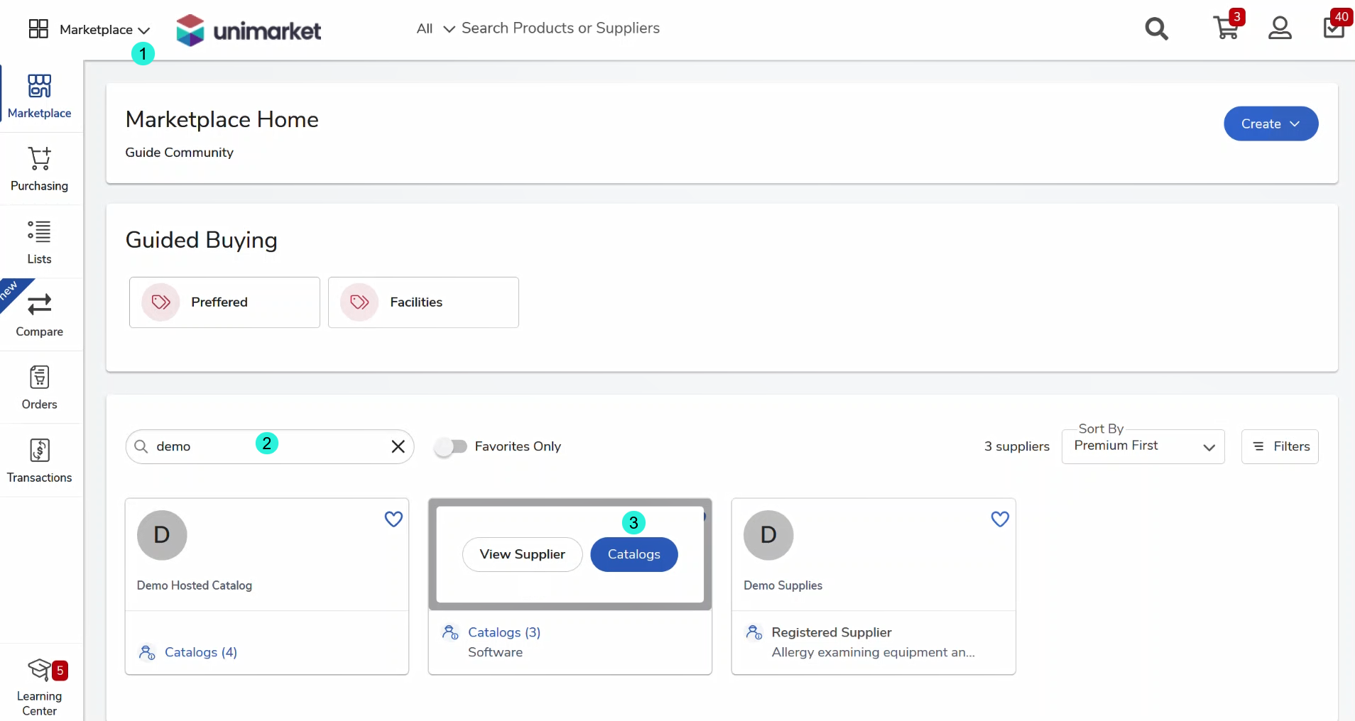 Marketplacemodule > in the Find Supplier field, insert the desired supplier name.Access Catalog: Hover over the supplier card and click Catalogs.