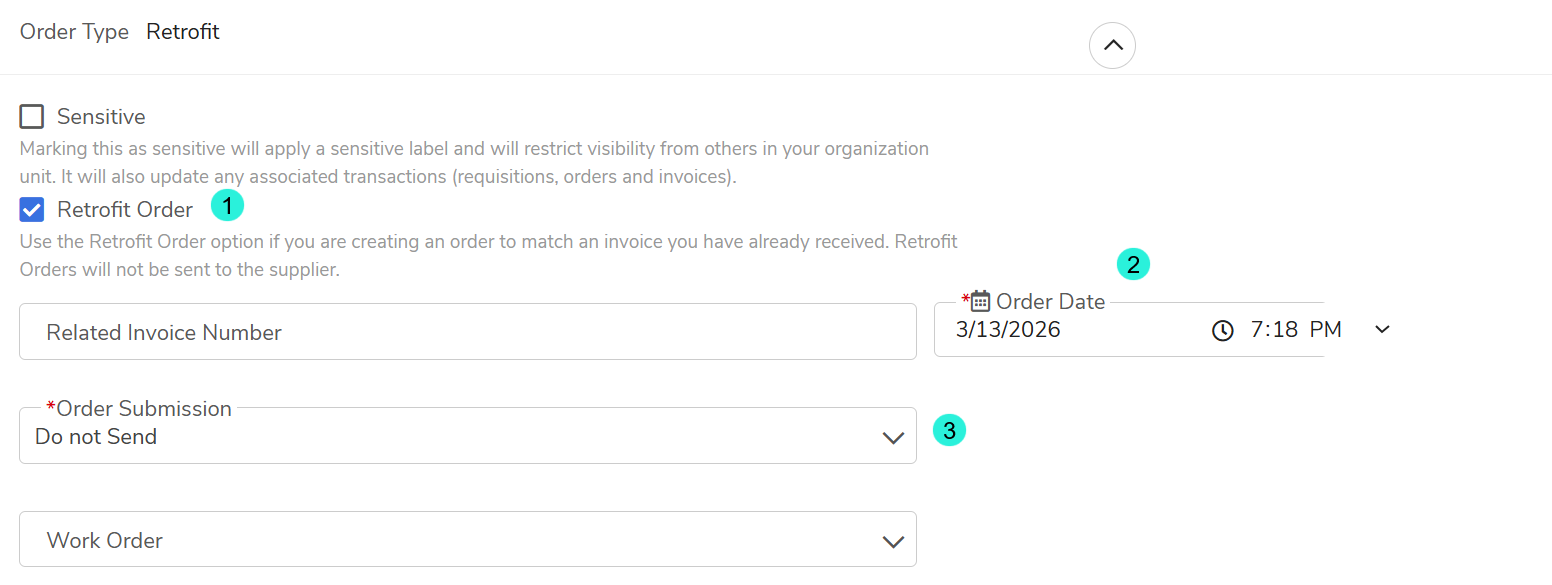 Designated Retrofit Status: Check the box titled Retrofit Order.
