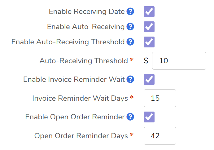 - Enable Open Order Reminder: Sends email reminders for orders that remain open and are not fully received (or manually closed) after the specified number of days designated in the Open Order Reminder Days field.