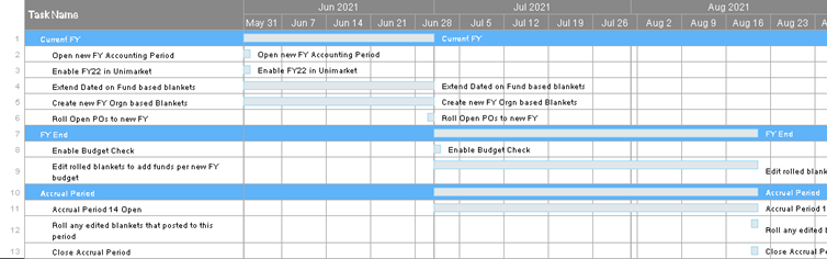 | Accrual Period 14 Open | 07/01-TBD | Purchasing | If you are not doing dual fiscal years. Turn off previous FY (in Unimarket), the first day of the fiscal year. |