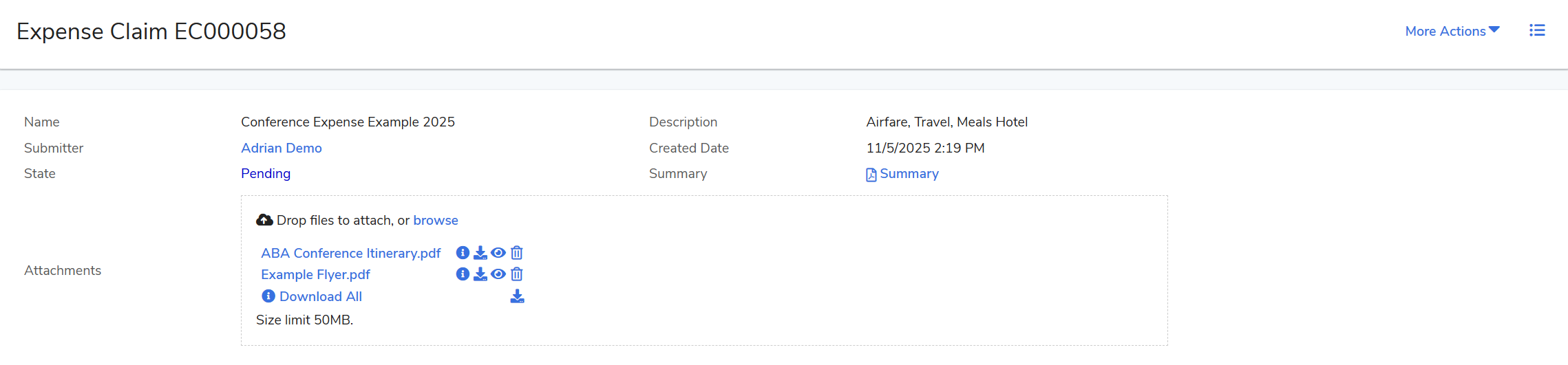 This tab provides the high-level context of the claim, including the Business Purpose, total amount, and any header-level attachments or comments.