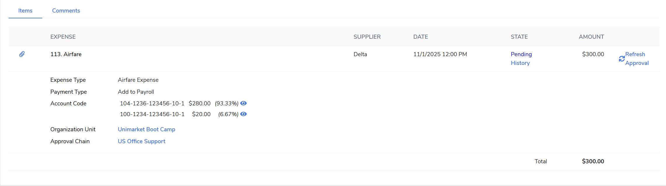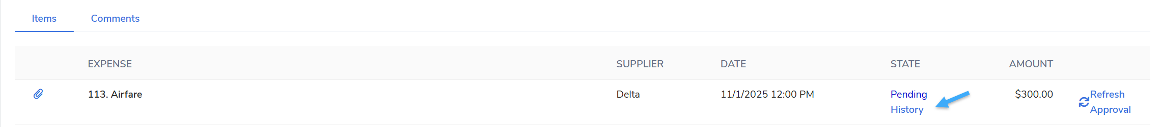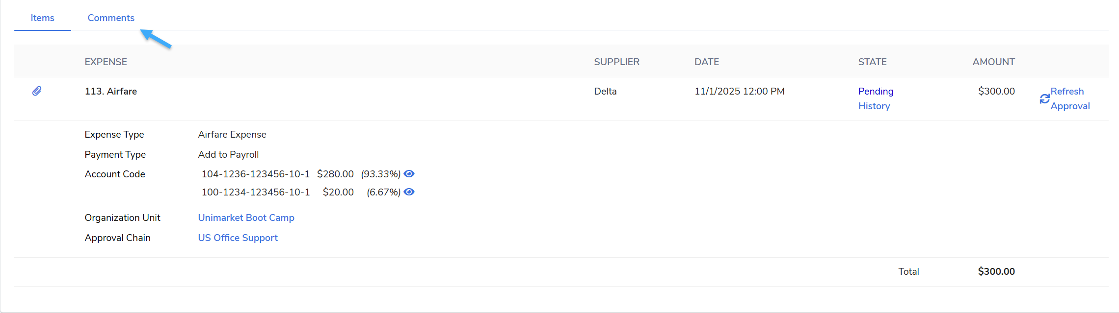 The Comments tab within an expense claim serves as a valuable collaboration tool. Allowing users to view existing notes post commentary, and ask questions pertaining to the expense claim.