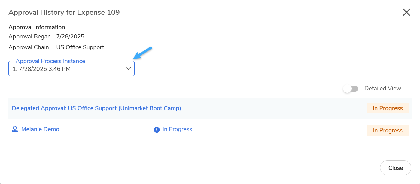 - View Previous/Future Approval Actions: View details by selecting the dropdown in the Approval Process Instance field.